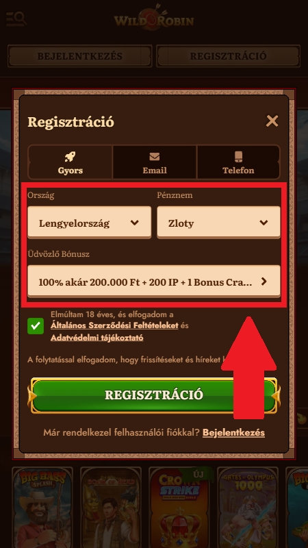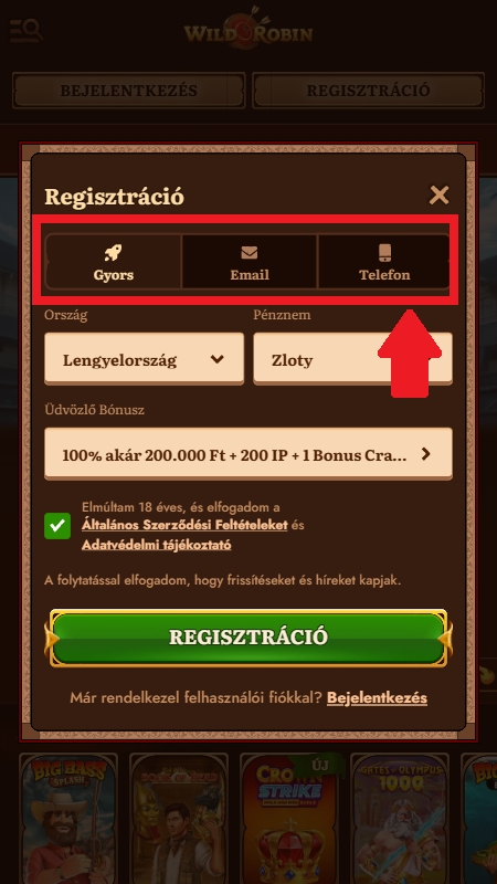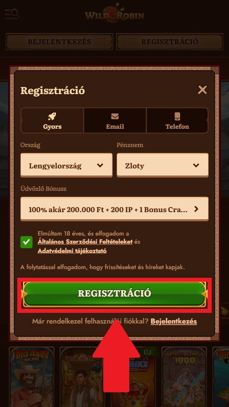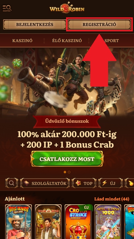 A WildRobin kaszinó regisztráció pár perc alatt meg is van, csak kövesd az alábbi lépéseket: